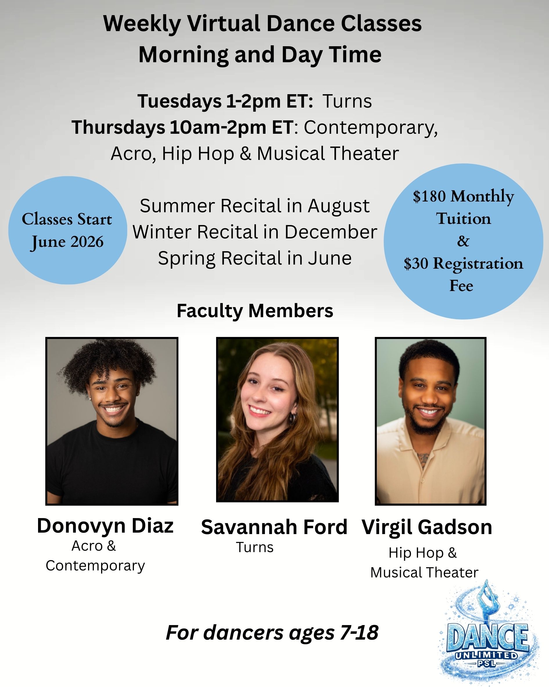 While Dance Unlimited PSL will make every reasonable effort to ensure all promoted faculty members are present, instructor availability is subject to change due to emergency situations or circumstances beyond our control. If an instructor is unable to attend, a qualified alternate instructor will facilitate the designated class(es).
